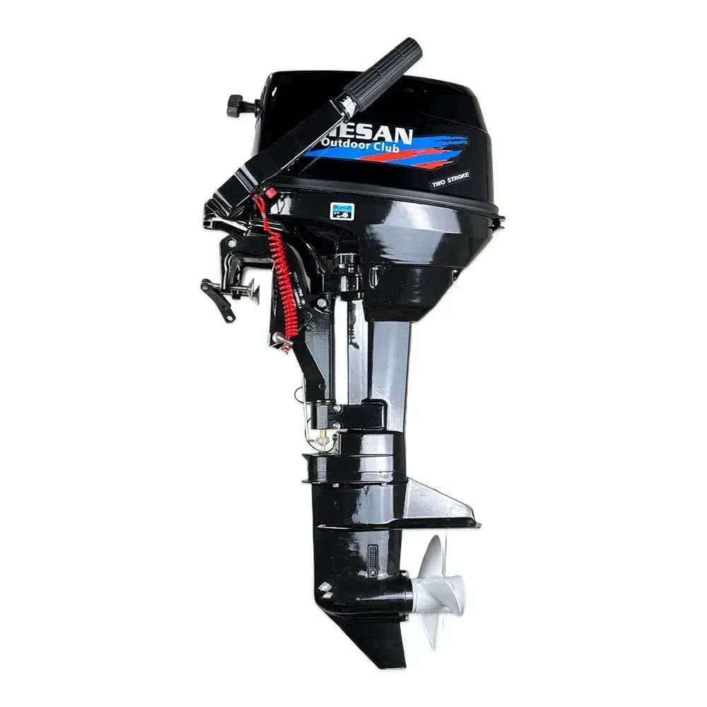 Двухтактный бензиновый мотор Mesan мощностью 9.8 л.с., рабочим объемом двигателя в 169 куб. см и весом 33 кг имеет румпельное управление (ручка газа на румпеле). Запуск двигателя производится вручную, максимальное количество оборотов на таком двигателе составит 5500, это придаст мотору неплохую скорость, а переключение передней, нейтральной и задней передачи подарят более точное переключение для определенного случая.