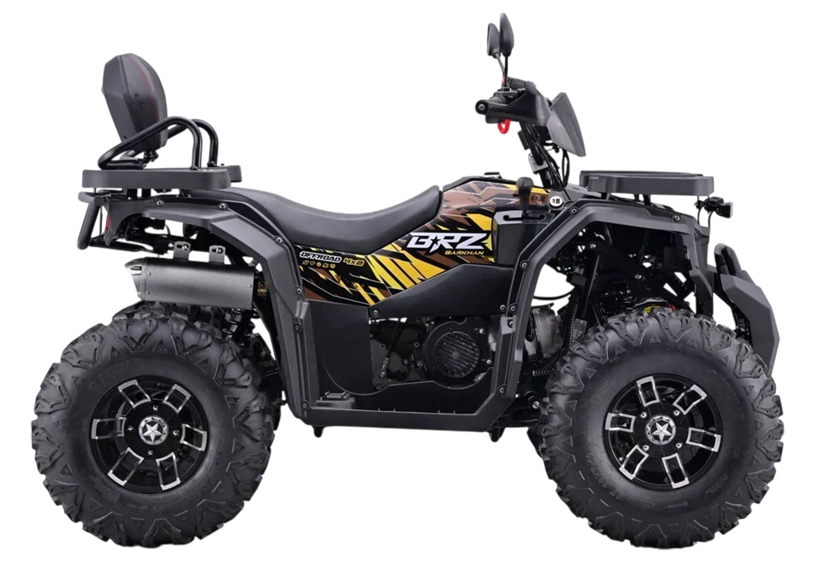 Квадроцикл BRZ Barkhan 200 — вездеход повышенной проходимости, созданный специально для эксплуатации в сложных дорожных условиях и бездорожья. Этот утилитарный аппарат обладает отличными техническими характеристиками и предназначен для активного отдыха, охоты, рыбалки, путешествий и хозяйственных нужд. В базовой версии BRZ Barkhan 200 имеет зеркала, защиту рук, мощную светодиодную оптику, крепкие багажники спереди и сзади, кенгурятник, LCD-приборная панель, страховочная чека, фаркоп и многое другое. Мотор квадроцикла BRZ Barkhan 200 оснащен масленым радиатором и баланс.валом. Barkhan в базе оснащен дисковыми тормозами спереди и сзади. Чтобы вы могли завести квадроцикл даже в самый непредвиденный случай BRZ Barkhan 200 оснащен помимо удобного электростартера, также и кик-стартером. BRZ Barkhan 200 идеально подходит для тех, кто ценит надежность, простоту обслуживания и способность справляться с любыми дорожными условиями.