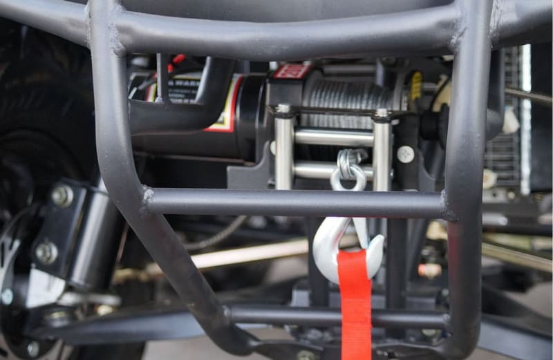 Квадроциклом можно управлять на расстоянии с помощью пульта дистанционного управления с функцией сигнализации. Высокие покрышки на 8-дюймовых колесах справляются с серьезными препятствиями, неглубоким снегом и бродами. Для экстремальных условий можно использовать цепи противоскольжения. Два металлических багажника не только пригодятся для перевозки грузов, но и защитят пластиковые крылья от повреждений.