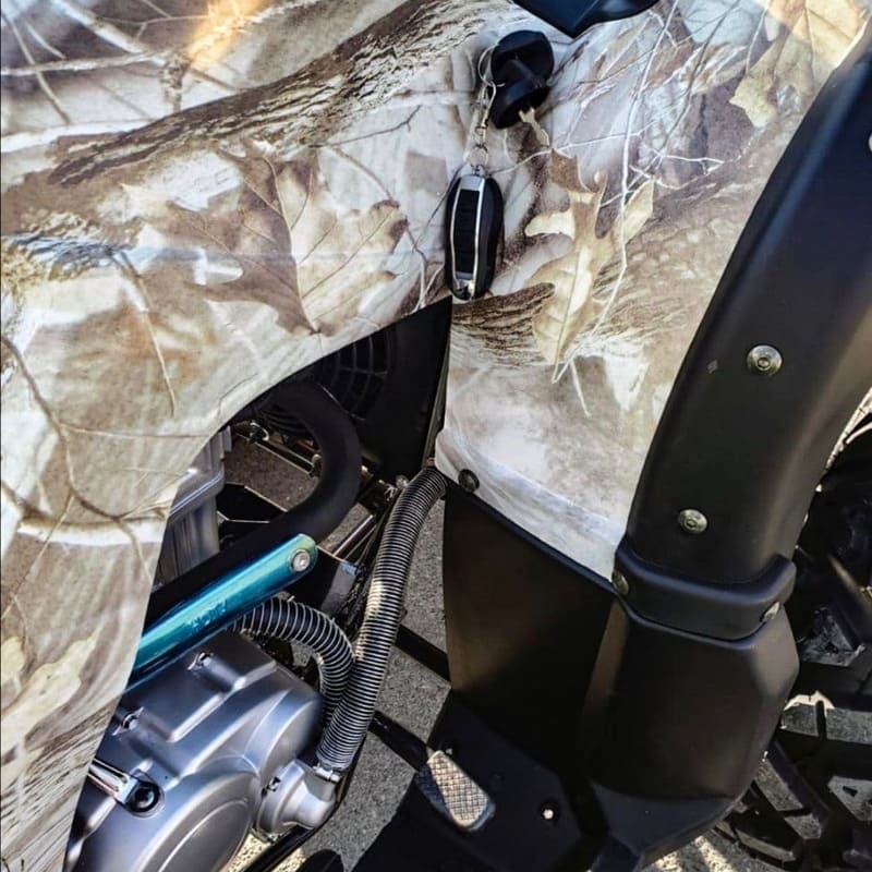 Квадроциклом можно управлять на расстоянии с помощью пульта дистанционного управления с функцией сигнализации. Высокие покрышки на 8-дюймовых колесах справляются с серьезными препятствиями, неглубоким снегом и бродами. Для экстремальных условий можно использовать цепи противоскольжения. Два металлических багажника не только пригодятся для перевозки грузов, но и защитят пластиковые крылья от повреждений.