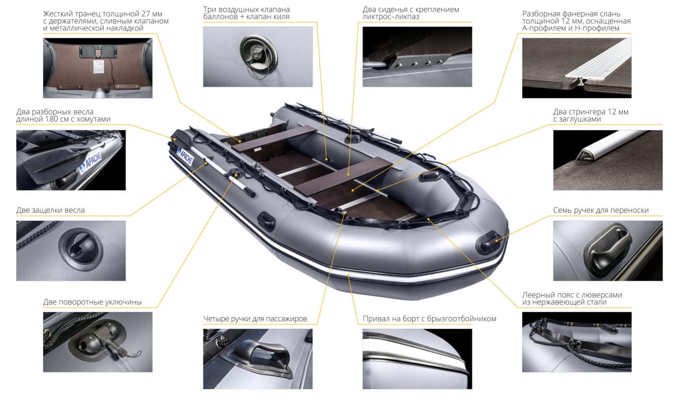 Конусообразная форма кормовых концов баллонов помогает быстрее выходить на глиссирование, а также безопасно встречать волну. Диаметр борта лодки Апачи 3500 СК вместе с трехметровыми габаритами наделяет плавсредство хорошей плавучестью