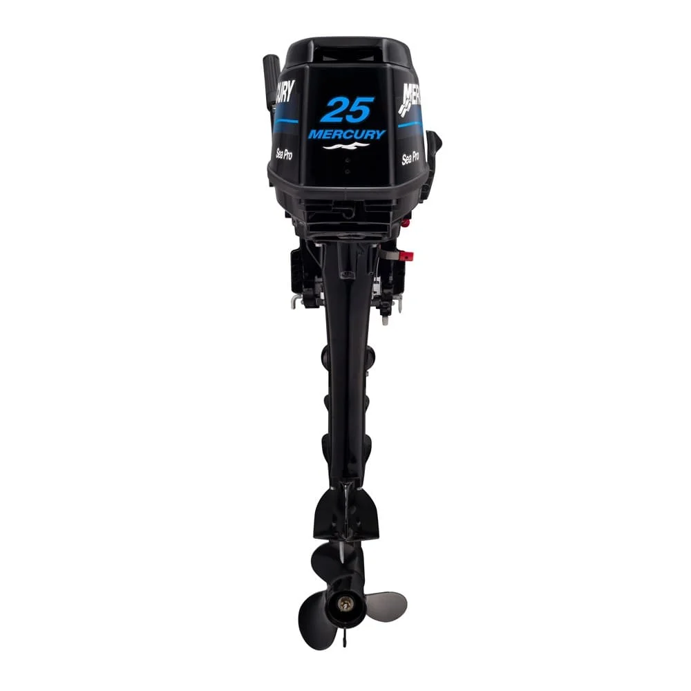 Мотор серии Sea Pro - выносливый, мощный и неприхотливый. Фактически мотор Меркури 25 Sea Pro, аналог мотора Меркури 30, дефорсирован путем установки прокладки в карбюраторе. Смысл дефорсирования - работа мотора на максимальных оборотах становится намного экономичнее в плане топлива и существенно увеличивается ресурс мотора. Его можно использовать как для повседневной жизни - отдыха, рыбалки, так и в коммерческом использовании, в тяжелых условиях работы. Mercury 25 Sea Pro имеет классическую систему управления - газ на румпеле, переключение передач на корпусе мотора. Он легко переделывается в дистанционный вариант и имеет в дополнительном оборудовании возможность установить выпрямитель и запитать бортовую систему лодки или катера от работающего двигателя.