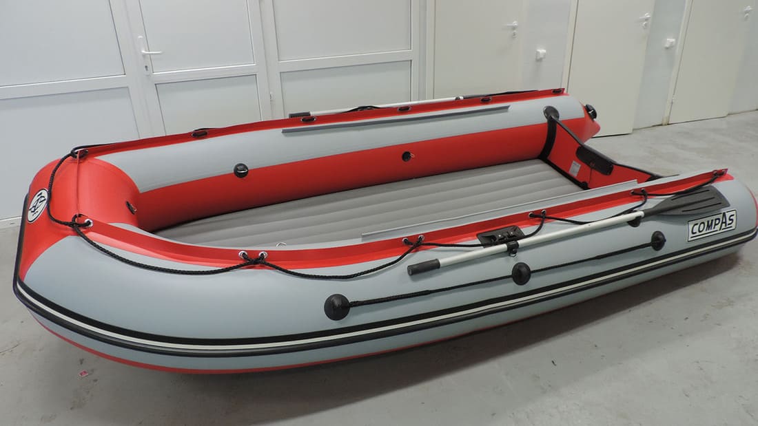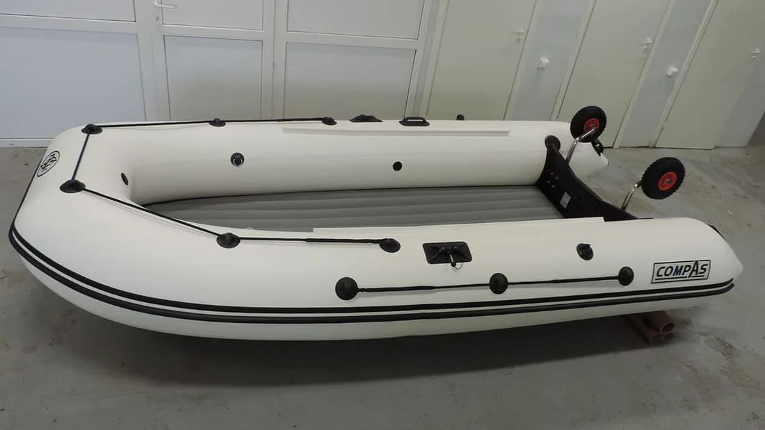 Лодка Compas 380s с надувным дном низкого давления (нднд) с заданной килеватостью. Способ крепления надувного дна к баллонам исключает взаимный износ и запатентован.