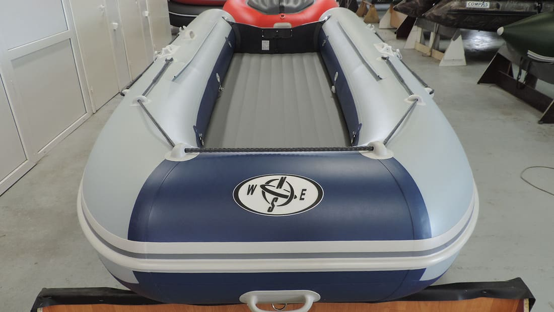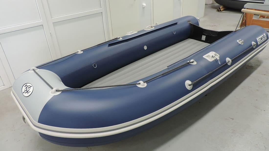 Лодка Compas 400 с надувным дном низкого давления (нднд) с заданной килеватостью. Способ крепления надувного дна к баллонам исключает взаимный износ и запатентован