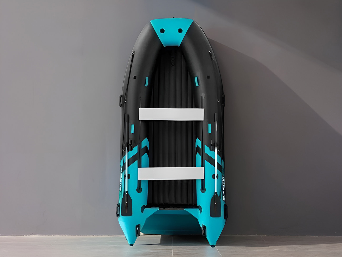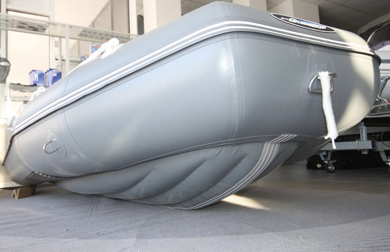 Лодка ГЛАДИАТОР E380 - имеет объемное надувное дно низкого давления НДНД, вклеенное в нос и борта, которое надувается в считанные минуты. Все наиболее уязвимые места нижней части лодки (киль и баллоны) усилены броней из 5 мм полиуретановой ленты (ширина брони по килю - 8см, по баллонам - 20 см). Стационарный транец из высококачественной влагостойкой ламинированной фанеры марки ФСФ российского производства (толщина 27 мм) под мотор 30 л.с. располагается на подушке, которая предохраняет его при столкновении с каменистым дном или большими валунами на дне реки.