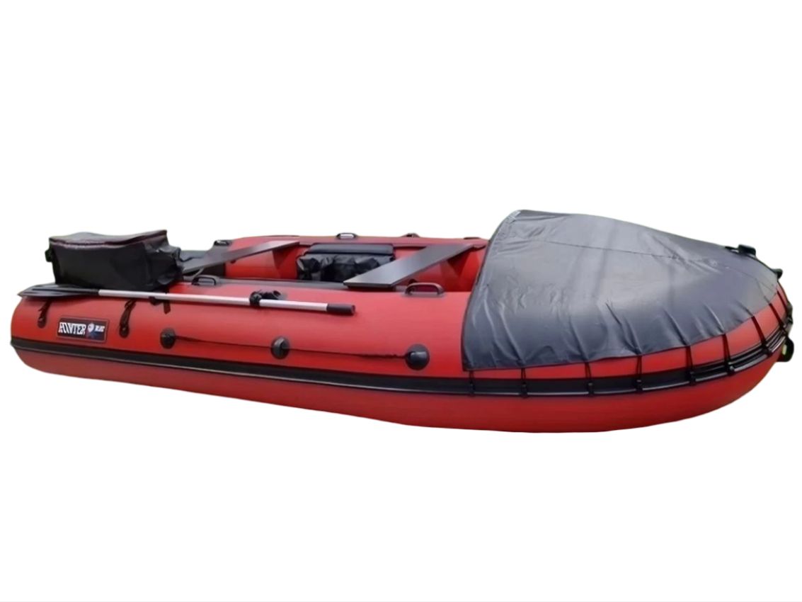 Лодка ПВХ ХАНТЕР Travel 370-с надувным дном и килеватым профилем, армированными швами и двойными баллонами, оснащена жёсткой алюминиевой сланью, надёжным транецом, складными сиденьями и удобными ручками; быстро собирается, компактно хранится и стабильно держит курс на воде.