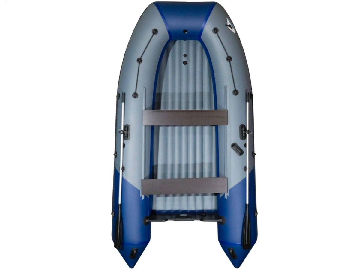 - Лодка изготовлена из высококачественного ПВХ с плотностью ткани 1000 г/м² для боковых и внутренних частей, что обеспечивает износостойкость, устойчивость к ультрафиолету и долговечность.