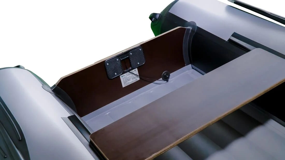- Жёсткий встроенный транец из водонепроницаемой фанеры толщиной 18 мм. с двумя накладками — позволяет использовать подвесной мотор до 8 л.с. Транец оборудован сливным клапаном.