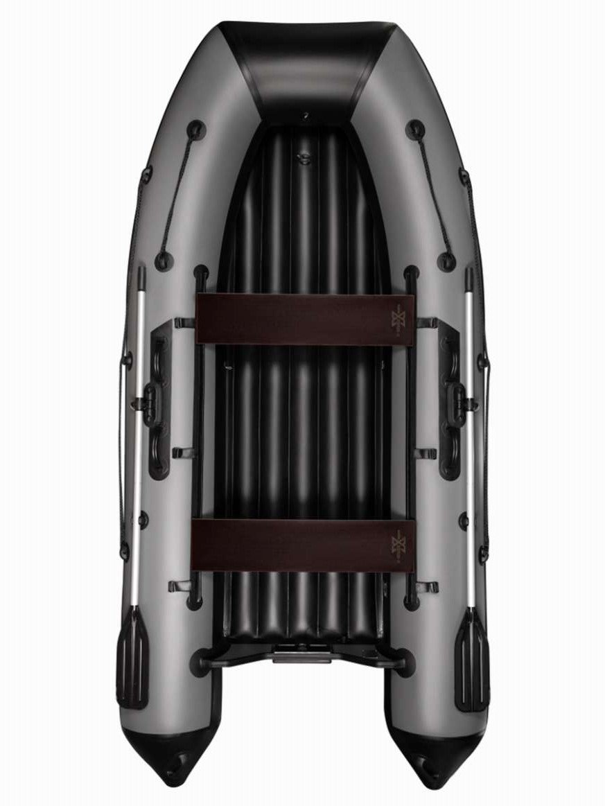 Лодка комплектуется надувным дном низкого давления, которое обеспечивает жесткость корпуса лодки, повышая устойчивость на воде и улучшая управляемость. Кроме того, продольные перегородки выполняют роль дополнительных ребер жесткости: пол практически не уступает по прочности твердым вариантам.