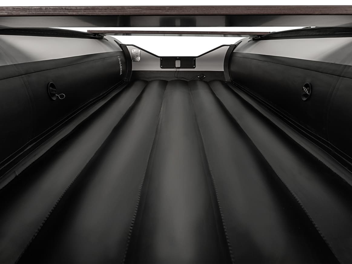 Лодка комплектуется надувным дном низкого давления, которое обеспечивает жесткость корпуса лодки, повышая устойчивость на воде и улучшая управляемость. Кроме того, продольные перегородки выполняют роль дополнительных ребер жесткости: пол практически не уступает по прочности твердым вариантам.