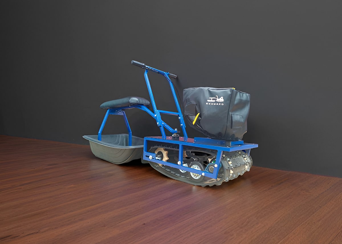 Компактный - поместится в любой автомобиль! Возможность передвижения по небольшому снегу, насту и укатанным дорожкам, в т.ч. по бурановскому следу Быстросъемный двигатель с функцией натяжения цепи Общий вес ходовой 50 кг, в т.ч. платформа 28 кг + двигатель 22 кг