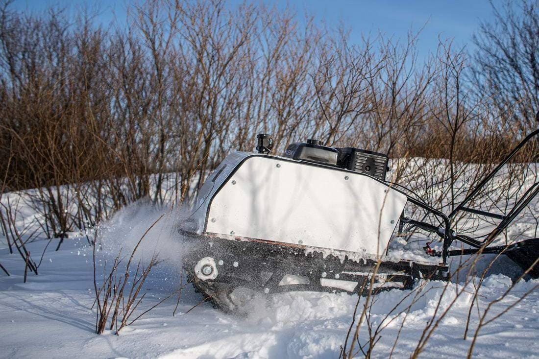 Мотособака весит 125 кг, а размер ее составляет 150 см в длину, 63 см в ширину и 80 см в высоту. Благодаря своим параметрам и конструкции мотобуксировщик может маневрировать и проходить по рыхлой и мягкой почве.