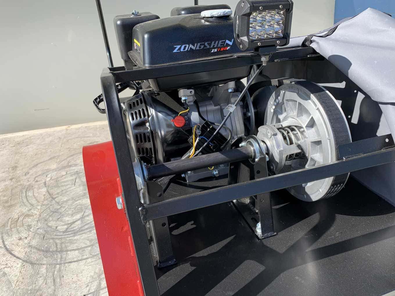 На мотособаку на заводе ставят китайские движки марок Лифан или Лончин мощностью 15 или 20 лошадиных сил. Данная мощность позволяет перевозить груз на самой платформе мотобуксировщика до 50 кг, а сзади в санях до 300. При тестировании аналогичных буксировщиков мы увозили и 500 кг по укатанной дороге, но в глубоком снегу любой мотобуксировщик с большим грузом будет зарываться в снег. Однако если к данному мотобуксировщику приобрести лыжный модуль или модуль толкач проходимость мотобуксировщика значительно возрастет. А также повысится комфорт от управления. Управлять мотобуксировщиком с толкачем или лыжным модулем значительно легче, а также повышается скорость передвижения мотобуксировщика, тк при езде в санях сзади образуется сильная метель из под гусеницы, все это летит в лицо и ехать быстрее 20-30 км/час уже не хочется.