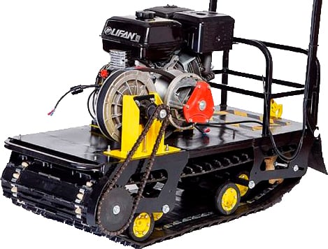 Мотособака весит всего 116 кг, а размер ее составляет 124 см в длину, 52 см в ширину и 80 см в длину. Благодаря своей легкости и компактности, мотобуксировщик способен маневрировать и проходить по рыхлой почве. К тому же мотобукс оснащен катковой подвеской, которая сглаживает ход, обеспечивает устойчивость на неровной поверхности, смягчает удары и вибрации от дороги.