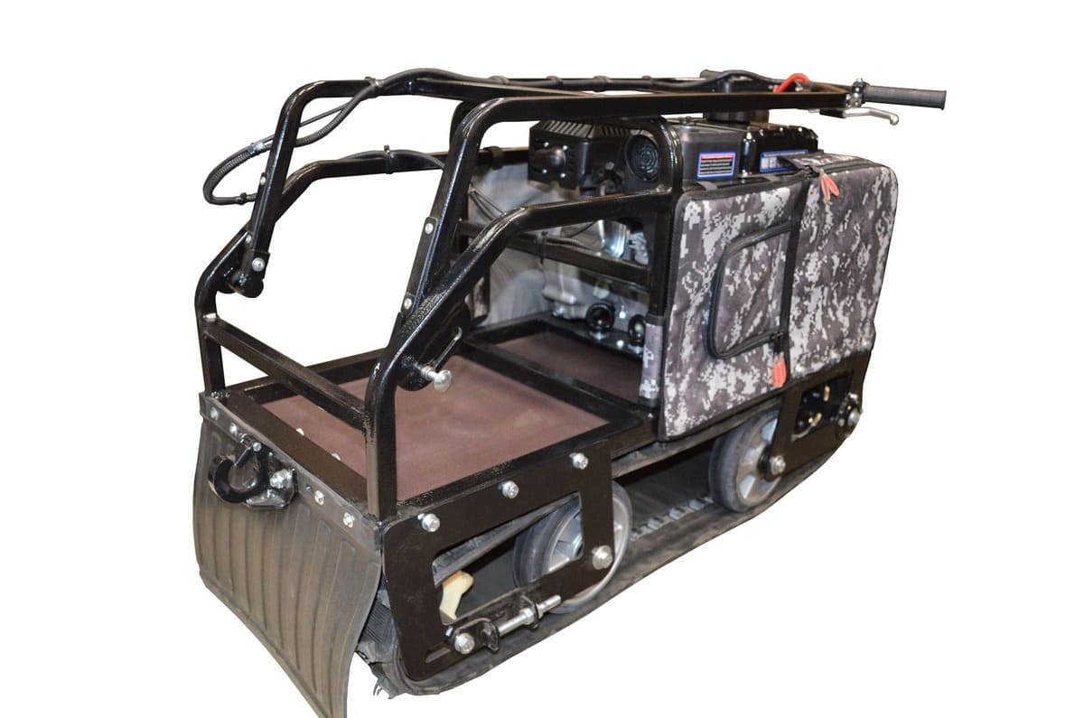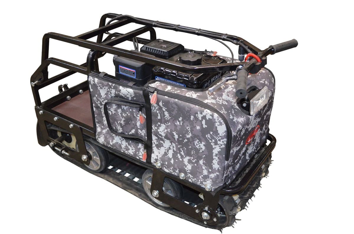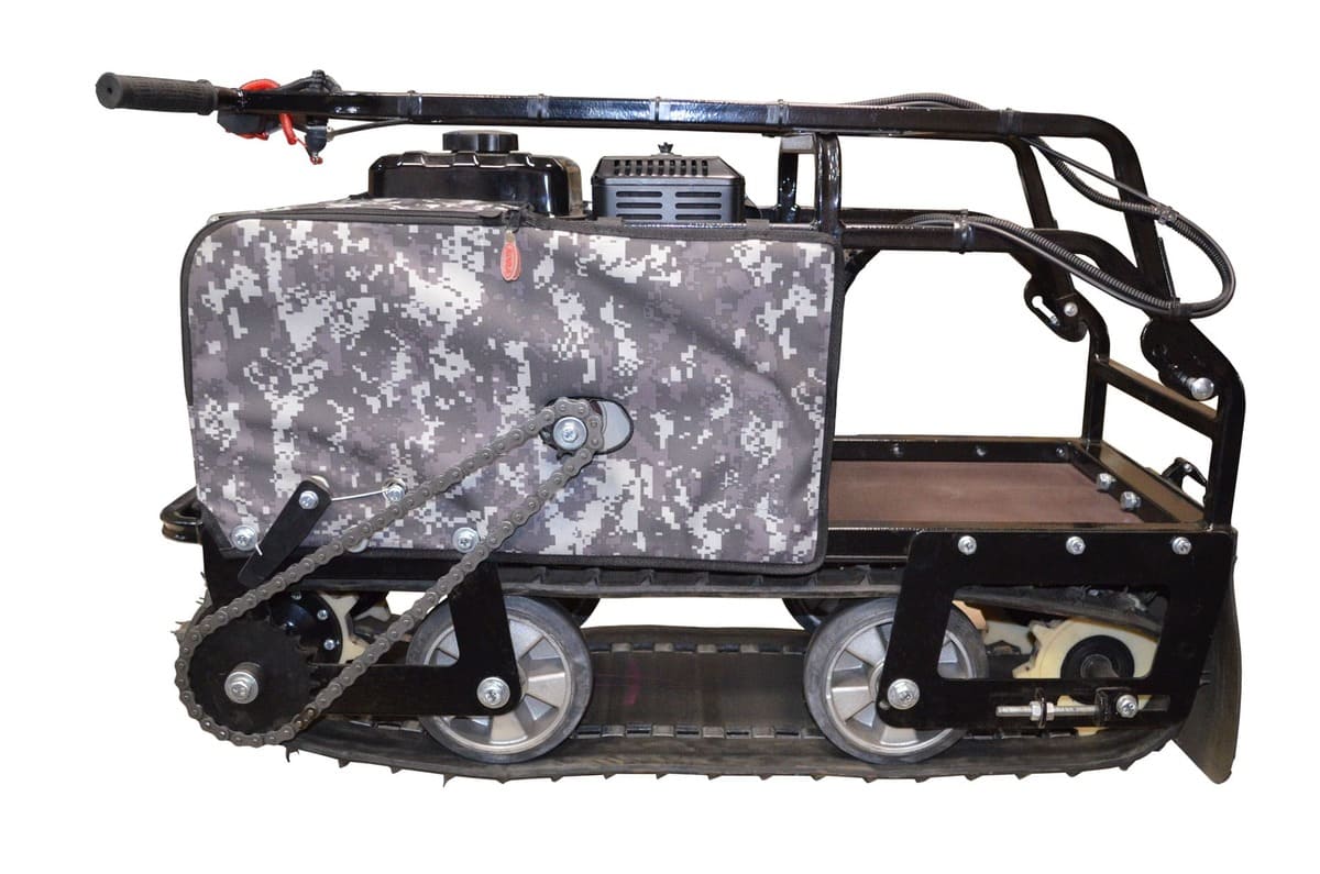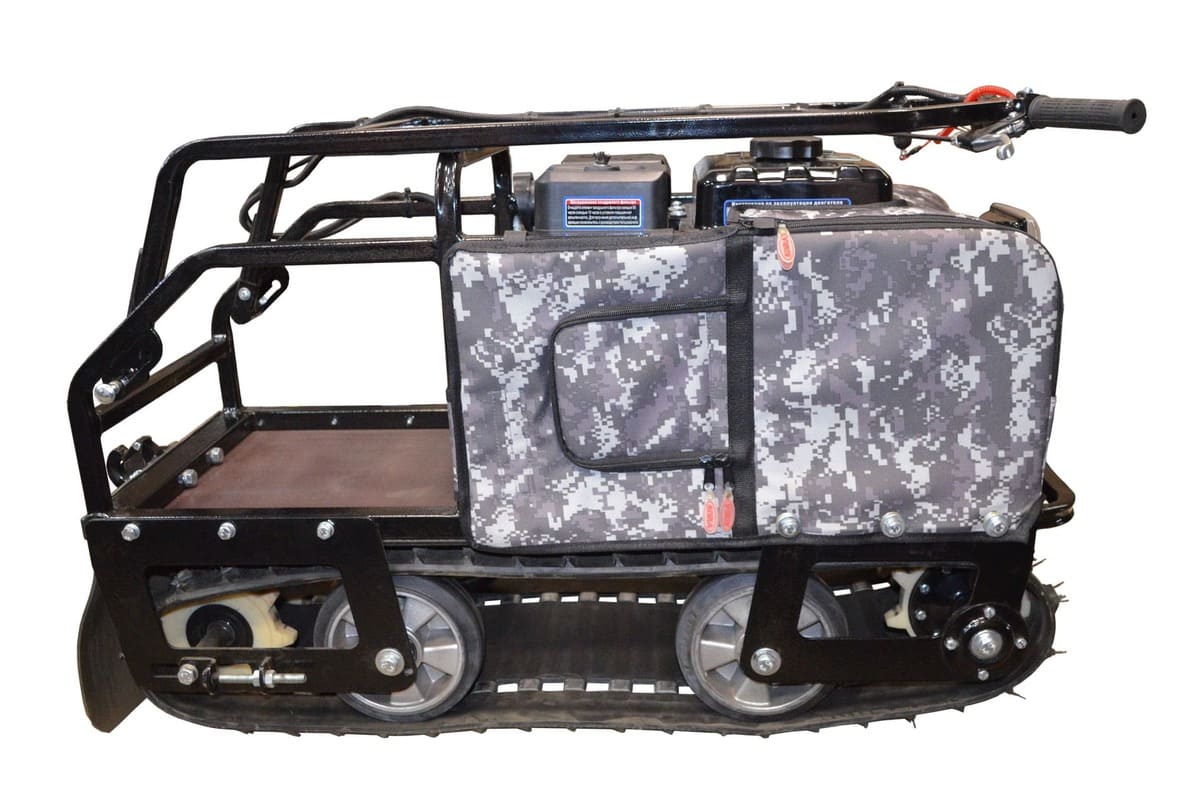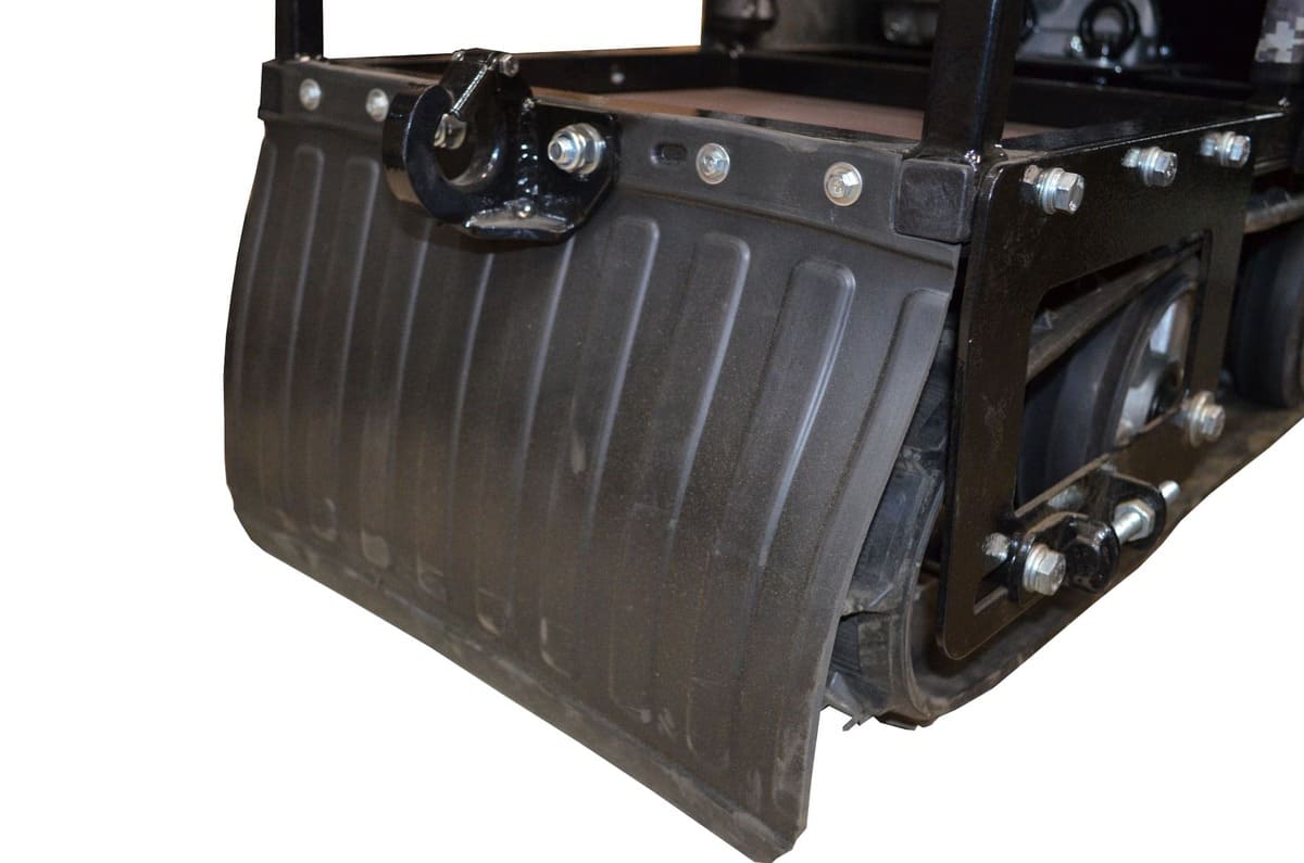 Мотобукс выпускается с гусеницей шириной 380 мм, которая изготовлена из прочного материала, что обеспечивает достаточное сцепление с любой дорогой (особенно, это важно для льда) и надежную работу в зимних условиях. Широкая поверхность равномерно распределяет вес, предотвращая проваливание в снег.