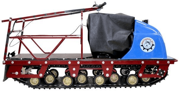 Мотособака весит 110 кг, а размер ее составляет 180 см в длину, 59 см в ширину и 84 см в высоту. Благодаря своей легкости и компактности, мотобуксировщик может маневрировать и проходить по рыхлой и мягкой почве. Кроме того, у мотобукса есть катковая подвеска, которая улучшает ход, обеспечивает устойчивость на неровной поверхности, а также смягчает удары и вибрации от дороги.