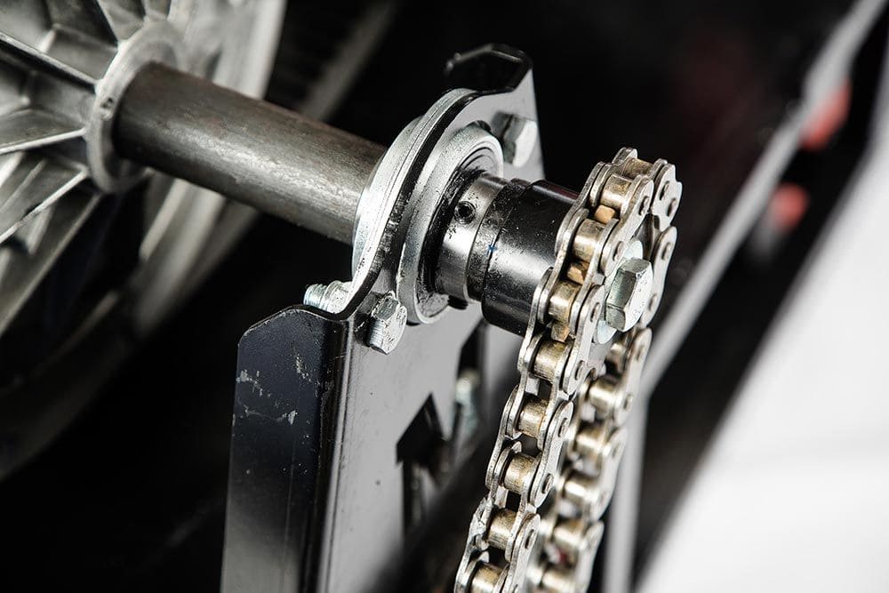 Увеличенный угол атаки позволяет с легкостью преодолевать глубокие снежные заносы. На ведущем валу мотобуксировщика установлены самоцентрующие подшипники. Смазка подшипника производиться без разборки ведущего вала и снят. Крепление руля вынесено выше платформы, что значительно повышает управляемость мотобуксировщика. Ширина руля средняя, что облегчает управление мотобуксировщиком в болоте и лесу. На мотобуксировщике установлен фаркоп. Это упрощает процесс крепления саней к мотобуксировщику, в отличии от стандартных прицепных устройств, где используется обычный рымболт.