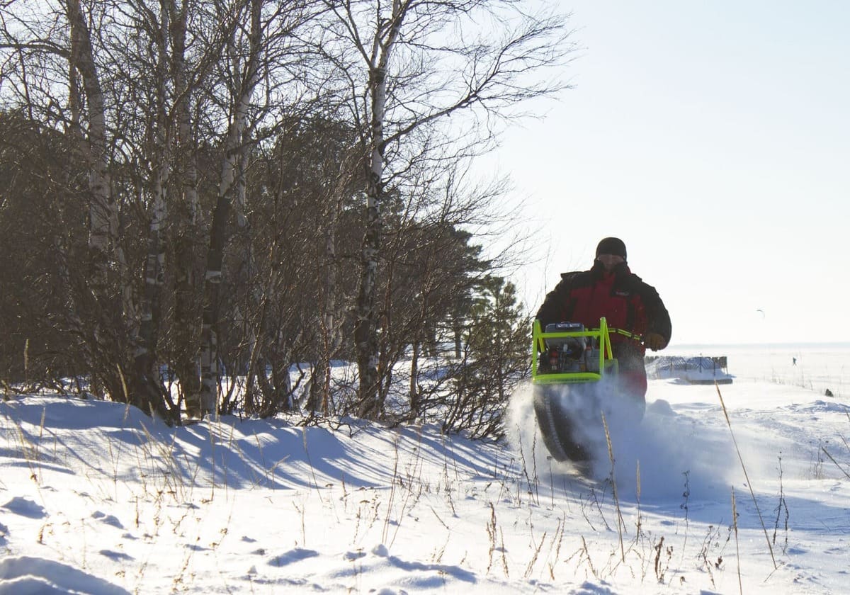 Мотобуксировщик Помор X1 оснащен гусеницей шириной 380 мм, что обеспечивает отличную проходимость по снегу и льду. Гусеница выполнена на основе прочного материала из резины с металлическими вставками для улучшения сцепления и износостойкости.