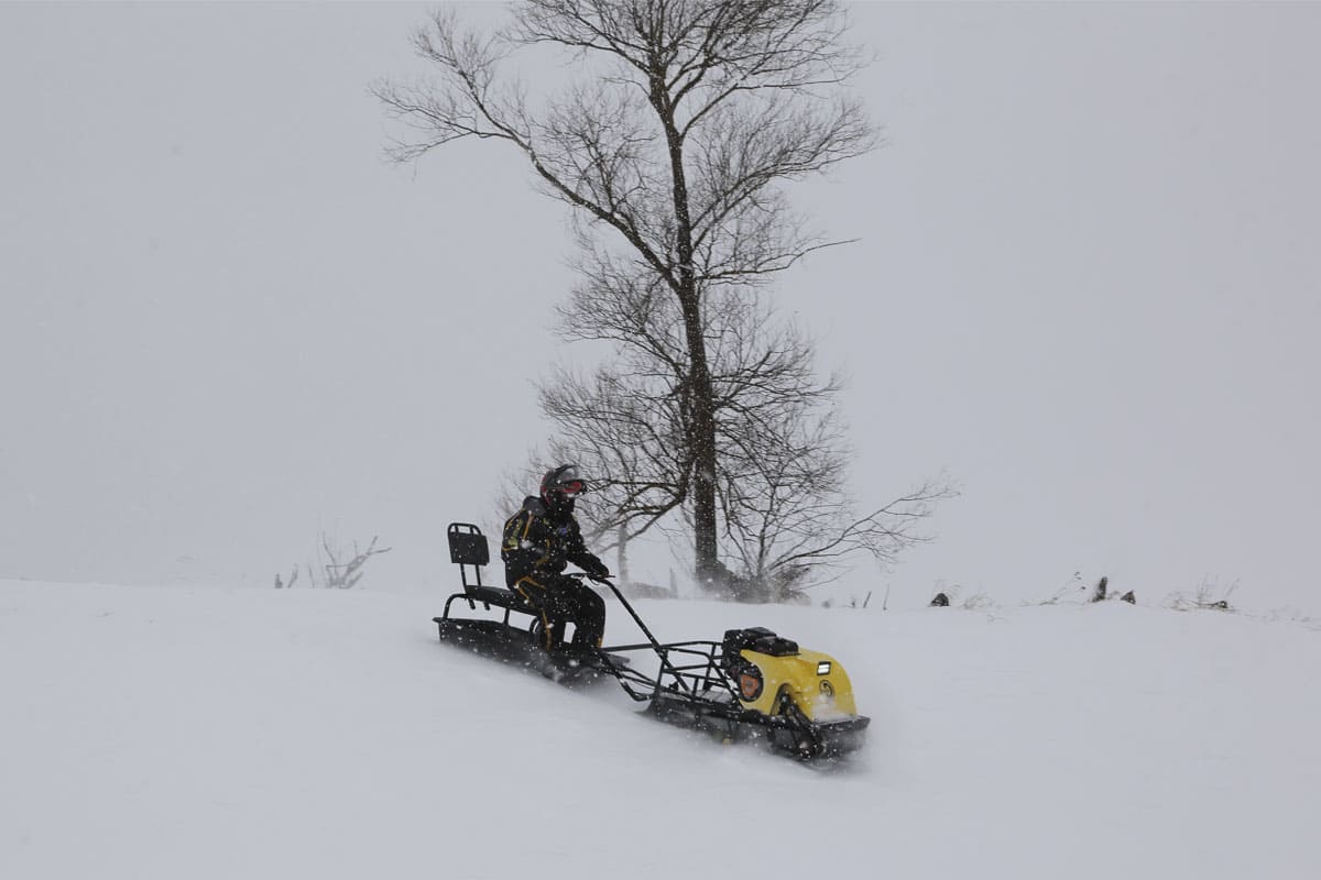Буксировщик оснащен 4-х тактным двигателем мощностью 15 л. с., достигающий скорость до 40 км/ч. Это позволяет быстро перевозить груз до 300 кг в санях и на специальной багажной площадке мотобуксировщика. Объем двигателя составляет 420 кубов.