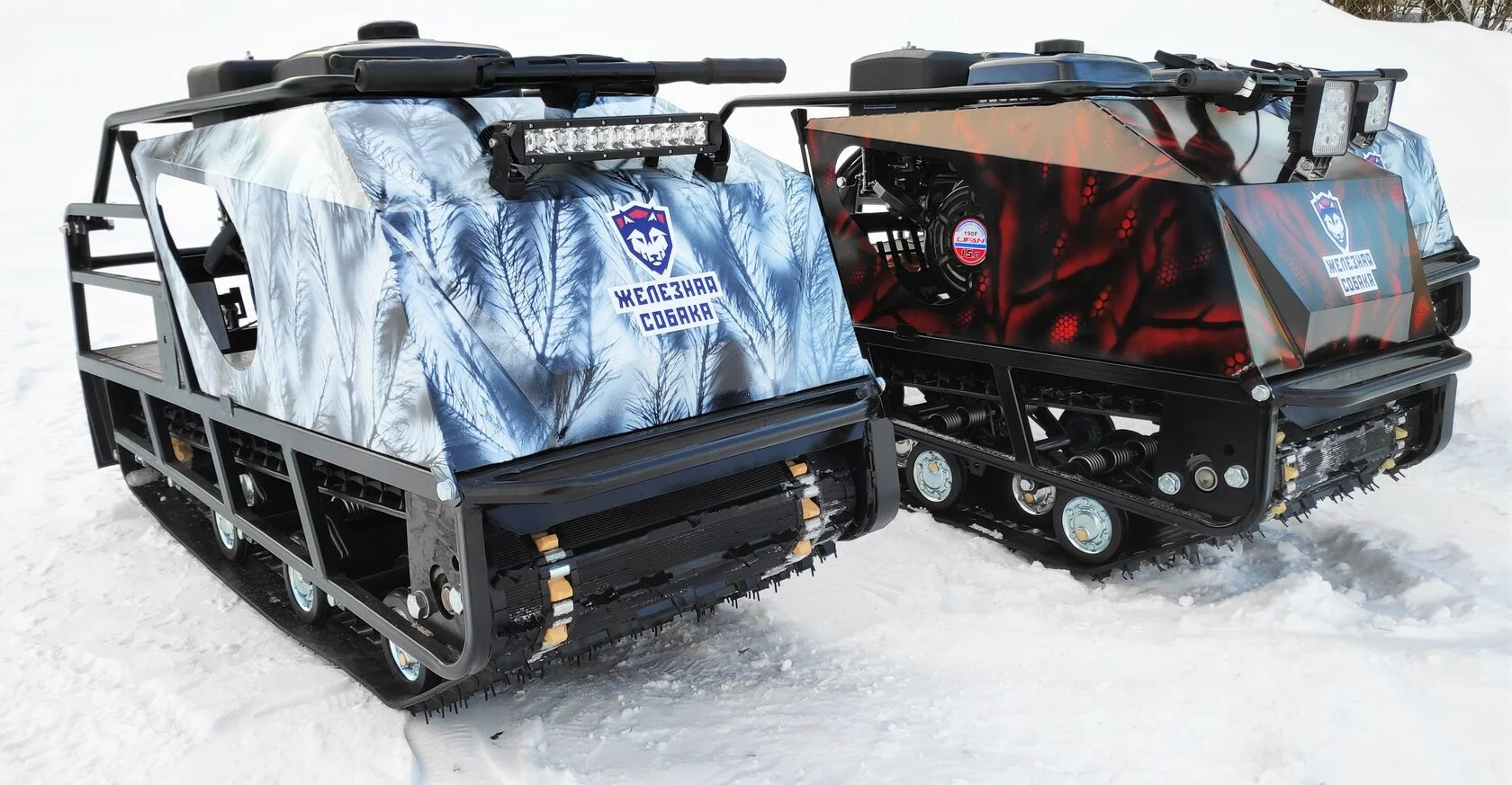 Мотособака весит 125 кг, а размер ее составляет 145 см в длину, 50 см в ширину и 74 см в высоту. Модель оснащена гусеницей шириной 500 мм. Гусеница в сочетании с катковой подвеской способна проходить спокойно по льду и даже по территории без снега.