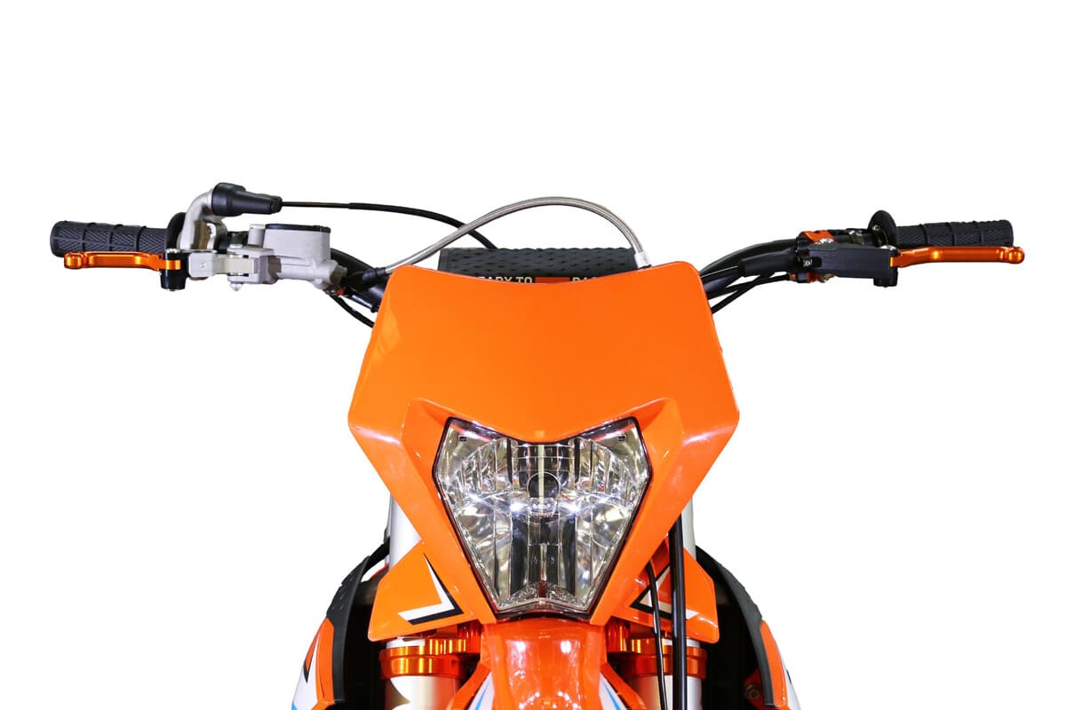 Регулируемая подвеска MNT спереди и моноамортизатор MNT сзади с прогрессией гарантируют комфорт и управляемость на любых неровностях. Короткоходная ручка газа обеспечивает быстрое реагирование на ваши действия, а алюминиевый маятник добавляет легкости конструкции. Сочный оранжевый цвет создает стильный и агрессивный образ, подчеркивая мощь и характер этого мотоцикла.