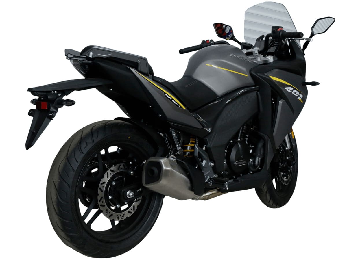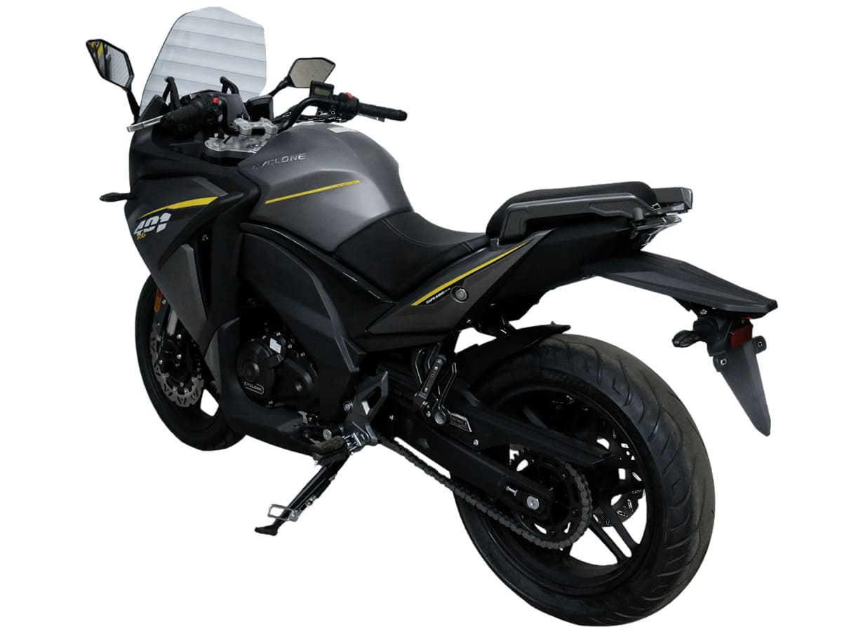 CYCLONE RG401 (SR400GS-B) – турист для покорения самых непростых и протяжённых маршрутов. Он обладает стремительным и современным дизайном в лучших “традициях жанра” туристических мотоциклов. В качестве силовой установки выступает рядный двухцилиндровый четырёхтактный двигатель объёмом 401 см3 , который выдаёт 45 л.с. на 9500 об/мин. Максимальный крутящий момент достигается на 8000 об/мин и составляет 37 Н·м. Инжекторный впрыск топлива с блоком управления BOSCH увеличивает топливную экономичность, а также позволяет добиться высокой приёмистости и неприхотливости агрегата. Жидкостная система охлаждения не допустит перегрева двигателя даже на самых непростых маршрутах. На мотоцикл установлена 6-ступенчатая механическая коробка передач. Максимальная скорость мотоцикла составляет 155 км/ч.