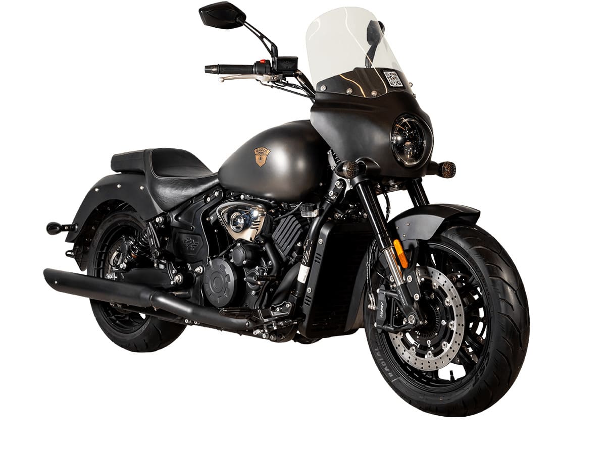 GROZA ML800 – круизёр, который всегда готов к тому, что обычная поездка перейдёт в путешествие. Головной обтекатель с лобовым стеклом выверены для того, чтобы защитить водителя и пассажира от набегающего потока воздуха или непогоды. Имея классическую геометрию и комфортную посадку, внешне этот круизёр рождает ассоциацию с военными мотоциклами времён Второй Мировой: детали подвески и масса других элементов выкрашены в чёрный цвет, обтекатели также имеют ровную тёмную окраску, на которой блестящие крепёжные винты выглядят подобно авиационным заклёпкам, и пара лаконичных глушителей без лишнего хрома. Нарядности этому суровому мотоциклу добавляют лишь хромированные накладки на блоке цилиндров и приковывающий внимание всех едущих позади массивный V-образный стоп-сигнал – настоящая визитная карточка круизёров GROZA.