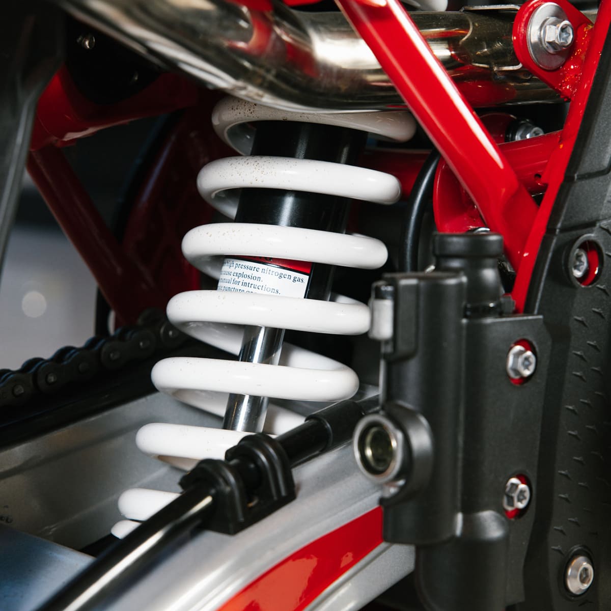 Хорошо зарекомендовавшая себя рама K5, усиленная и адаптированная под агрессивное катание, в тандеме с вилкой MNT 43 мм с регулировками и задним амортизатором обеспечивает уверенное поведение мотоцикла на сложном рельефе. Колёса диаметром 21 и 18 дюймов с покрышками Cordial и ободами UNISON из алюминия 7016 серии рассчитаны на высокие нагрузки. Дополняют надёжность ходовой части толстые камеры 3 мм и алюминиевая задняя звезда. Мотоцикл укомплектован деталями от ведущих производителей: ручка газа и тросы сцепления от NIBBI, удобный и лёгкий рычаг сцепления с функцией складывания, короткоходная ручка газа, грипсы AJ1 Lock On, а также широкие пеги AJ1, обеспечивающие уверенное сцепление даже в грязи.