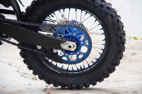 Он производится по гравитационной технологии литья, что дает высокую жесткость на скручивание. С завода маятник одет в пластиковую защиту. Она возьмет на себя все царапины и удары. Если захотите вернуть свой мотоцикл к заводскому внешнему виду – просто обновите защиты. Колеса На BRZ X6m применяются усиленные ступицы, которые сделаны из единого куска алюминия, обработанного на ЧПУ станке (CNC). 4мм усиленные спицы, алюминиевые обода «Enduro X series» из авиационного алюминия 7075. Шины Покрышки европейского бренда «Golden Tire», поставляемые под брендом Mariey, сделаны из умеренно мягкого компаунда, специально для эндуро. Имеют хороший зацеп на твердых каменистых поверхностях, также за счет высокого протектора хорошо работают по грязи и песку. Задняя покрышка шириной 140мм, теперь не нужно менять покрышки на новом мотоцикле! Подвеска BRZ X6m получил подвеску топопвую HT. Передняя вилка с картриджем закрытого типа QXF05RC. Диаметр зеркала 48мм. Вилка полностью регулируемая на отбой и сжатие. Задний амортизатор QXR05 с выносным бачком также имеет регулировки скорости отбоя и сжатия, плюс к этому есть возможность регулировки медленного сжатия за счет дополнительного перепускного клапана. Подвеска успешно справляется с большими нагрузками на скоростных кроссовых треках с высокими прыжками. Также ее можно расслабить для эндуро. Траверсы CNC траверсы выполнены из авиационного алюминия 7075. Выдерживают большие нагрузки, легкие и прочные.