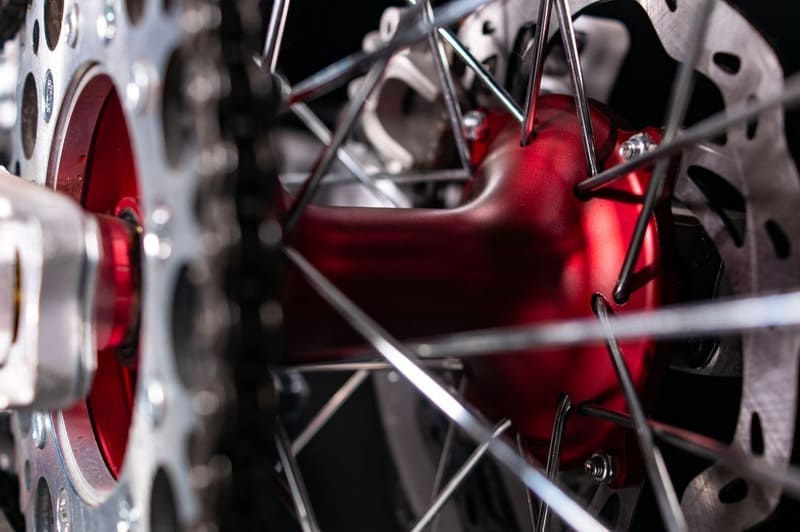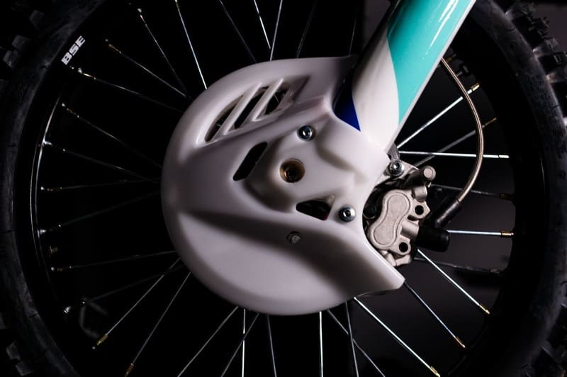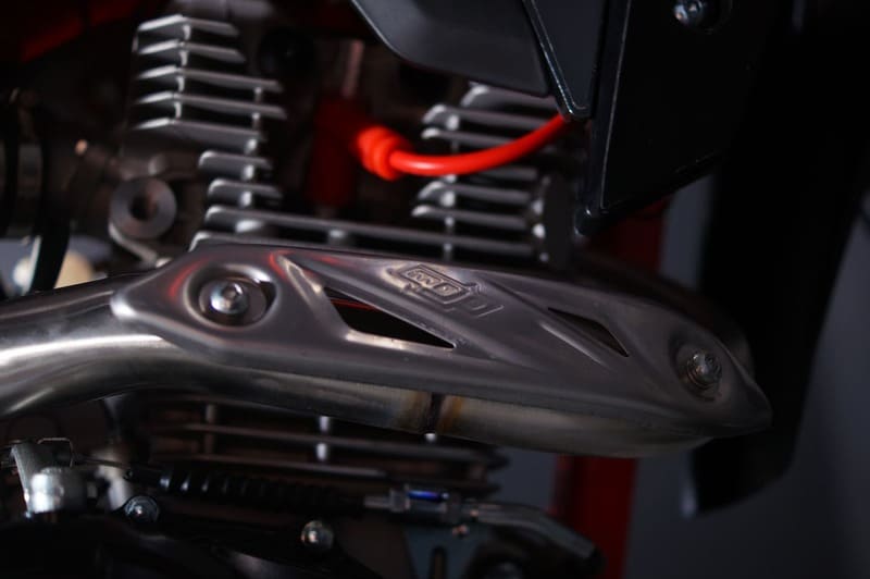 На мотоцикле установлено все необходимое для оффроуда: вилка “перевертыш”, литые рычаги задней прогрессии, алюминиевый маятник, прочный задний бугель, “злая” внедорожная резина Kenda. А также: усиленные легкосплавные колёсные диски MOJO, усиленная цепь, защита рук, датчик моточасов, прочные анодированные CNC ступицы, колесные подшипники NTN, защита коллектора, картера двигателя и тормозных дисков. Мощная гидравлическая тормозная система HSК Racing остановит байк в любых условиях.
