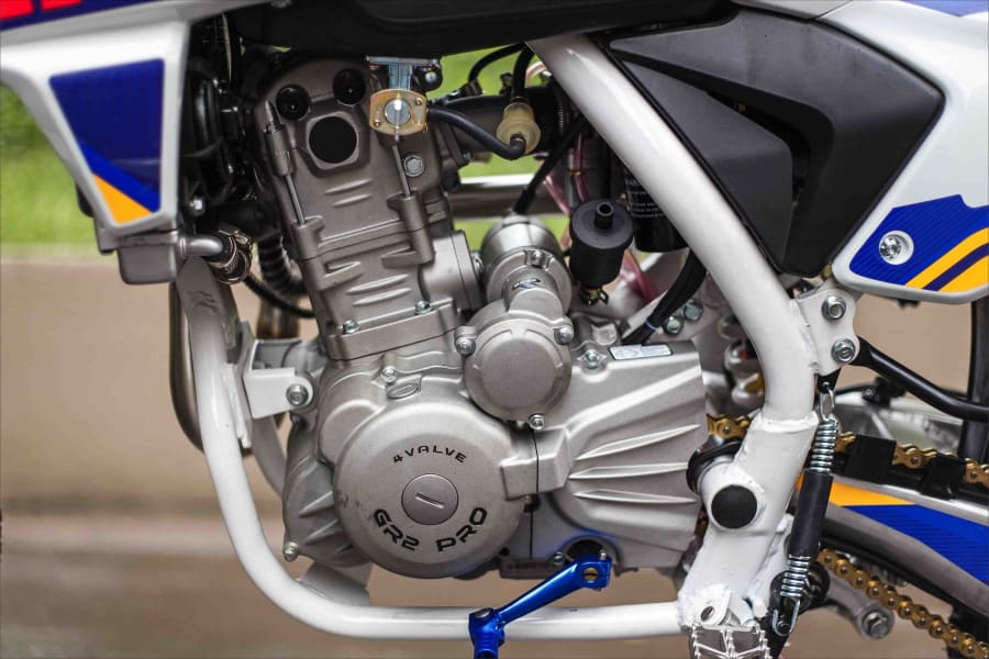 В стальной раме GR2 300 PRO установлен одноцилиндровый 4-тактник Zongshen 174MN жидкостного охлаждения с четырьмя клапанами в системе газораспределения. Мотор отличают сбалансированные показатели развиваемой мощности и крутящего момента в широком диапазоне оборотов. Подготовка топливной смеси поручена NIBBI PWK34 – это плоскодроссельный карбюратор с отличными показателями производительности при высоких нагрузках. За охлаждение двигателя отвечают два небольших радиатора, спрятанных за защитными обтекателями, с вентилятором принудительного охлаждения.