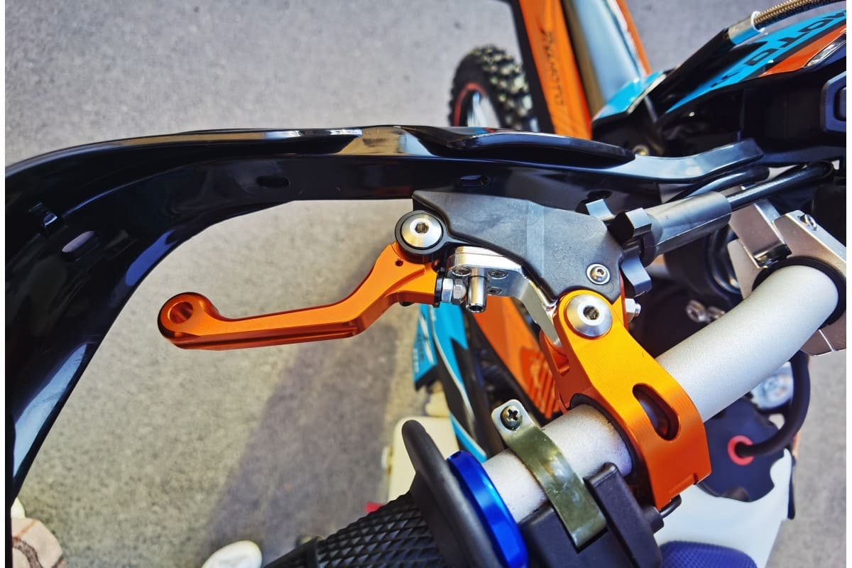 Пластик используется KTM2020 – очень прочный и распространенный, что делает его максимально возможным к обслуживанию. Руль IGP TwinWall 22/28 алюминиевый на всех моделях! Силиконовые грипсы Nibbi Racing – левая на замке, правая на короткоходной ручке газа Nibbi. Рычаги тормоза/сцепления – неломайки, из фрезерованного алюминия от CNC. Влагозащищенные кнопки старт/стоп на руле. Складной рычаг переключения передач, фрезерованный, из алюминия, от бренда PRO CAKEN. Лапка тормоза так же фрезерованная, алюминиевая. Самая легкая и прочная приводная цепь RK520MXZ уже установлена!