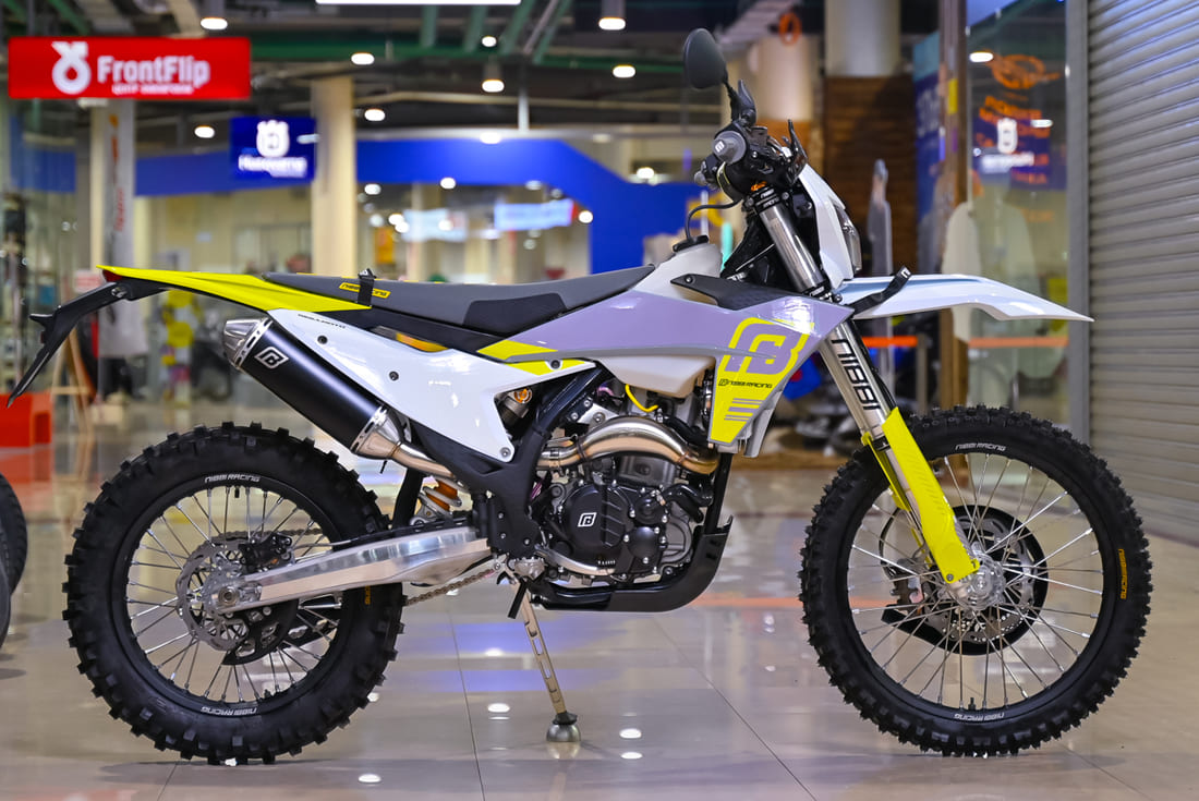 - Шины: Специальные шины 90/90-21 и 140/80-18 из уникального состава резины, которые «липнут» к поверхности, обеспечивая отличное сцепление.