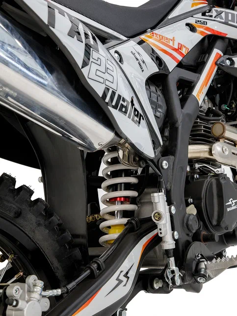 Подвеску Sharmax Expertpro 250-172 можно настроить под грязь, камни и песок без потери качества. Передняя вилка от KYB-Tech Advantage имеет регулировки сжатия и отбоя, задняя — от WP Xplor — справится с любыми преградами: от камней до деревьев. Байк легко настроить под свой вес, подобрав идеальный баланс жёсткости.