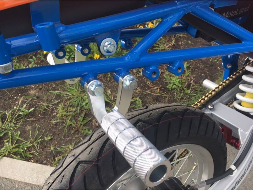 Задняя подвеска моноамортизатор с прогрессией, 410 мм. Вилка перевернутого типа, 780мм без регулировок. Колеса 21 /18 Дорожная резина, алюминиевые спицованные колесные диски.