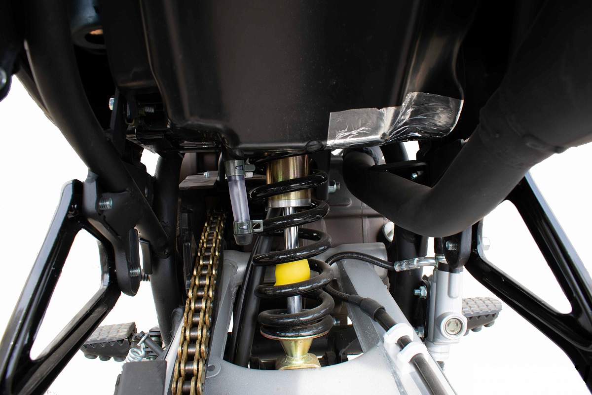Оснащение подвески новая модель унаследовала у популярного dualsport байка Regulmoto Sport 003. В передних траверсах вилки перевернутого типа установлены телескопические амортизаторы с диаметром штока 41 миллиметр. Конструкция задней части подвески представлена усиленным маятником с системой прогрессии и моноамортизатором с регулировкой сжатия пружины и двумя положениями установки на нижней проушине, что позволит менять высоту сиденья, которая по умолчанию составляет 920 миллиметров.
