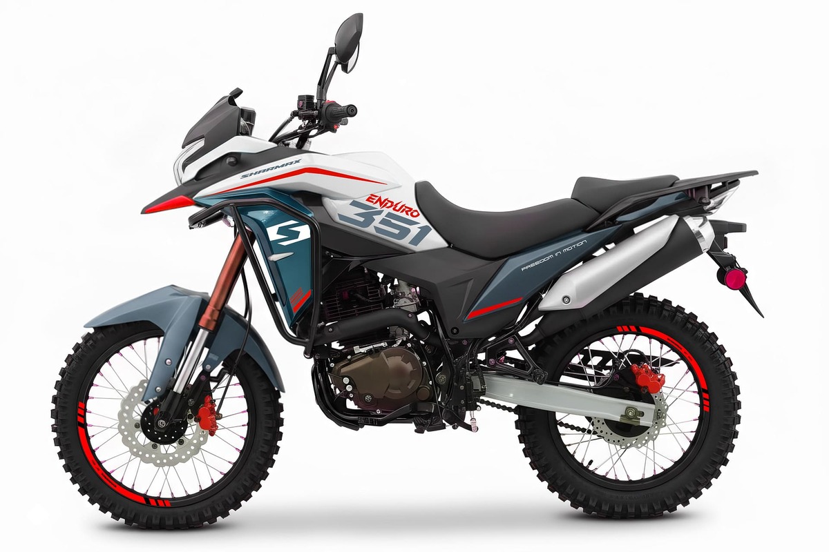 Sharmax 351 Enduro создан для тех, кому нужен один мотоцикл на всё. Не хочешь париться с выбором между дорожником и эндуро — бери этот байк. По асфальту едет как нейкед, по грунтовке — как лёгкий эндуро. 114 кг, 27 лошадей, простой карбюраторный мотор и подвеска, которая прощает ошибки. Для первых сезонов, для возвращения в строй, для тех, кто просто хочет кататься без заморочек.