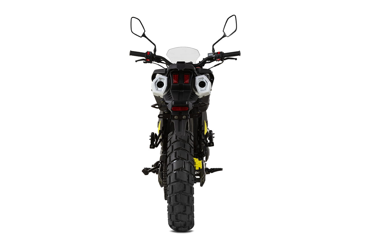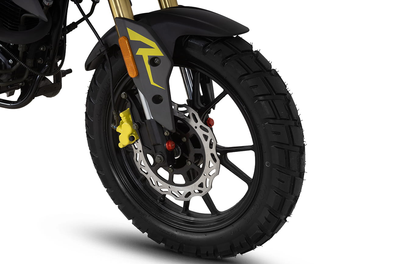 Массивные шины 110/90-17 передние и 130/80-17 задние придают байку статуса, внешне мотоцикл явно выбивается из класса малокубатурников. Эффектно выглядит протектор с крупным неглубоким шипом. Шины обеспечивают хороший зацеп на бездорожье и большое пятно контакта на асфальте. Диски спицованные, по классике для катаний по пересеченке.