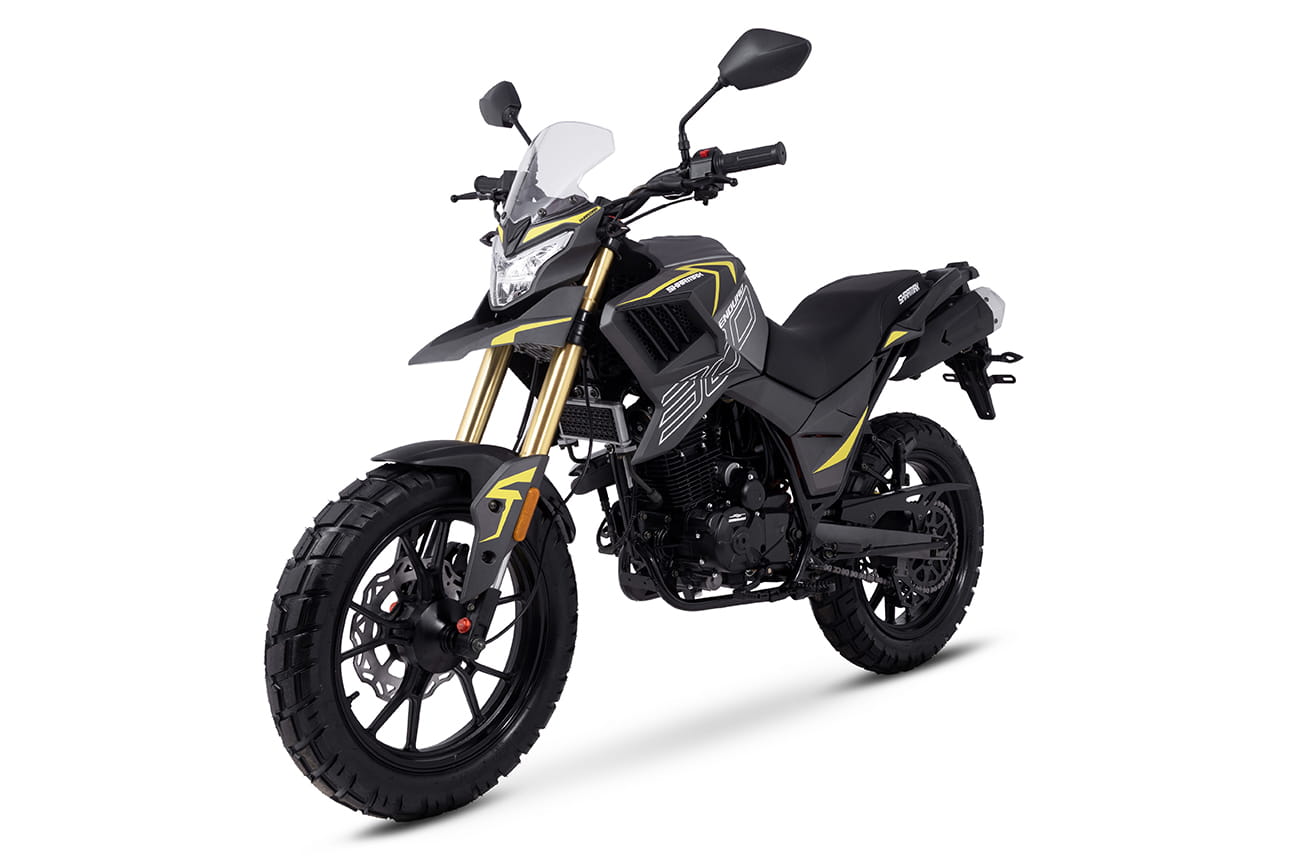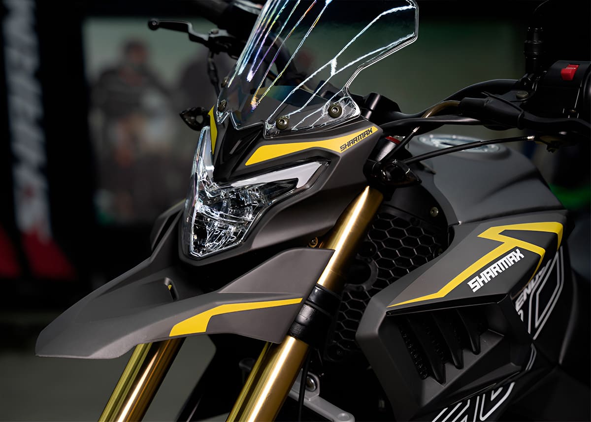 Из оснащения адвенчура Sharmax Enduro 300 выделяется эстетичная и эффективная светодиодная оптика вкруг, полностью электронная удобно читаемая приборка с крупными обозначениями скорости и оборотов и брутальное пластиковое оперение с рублеными линиями и массивными воздухозаборниками.