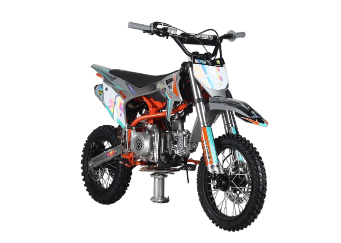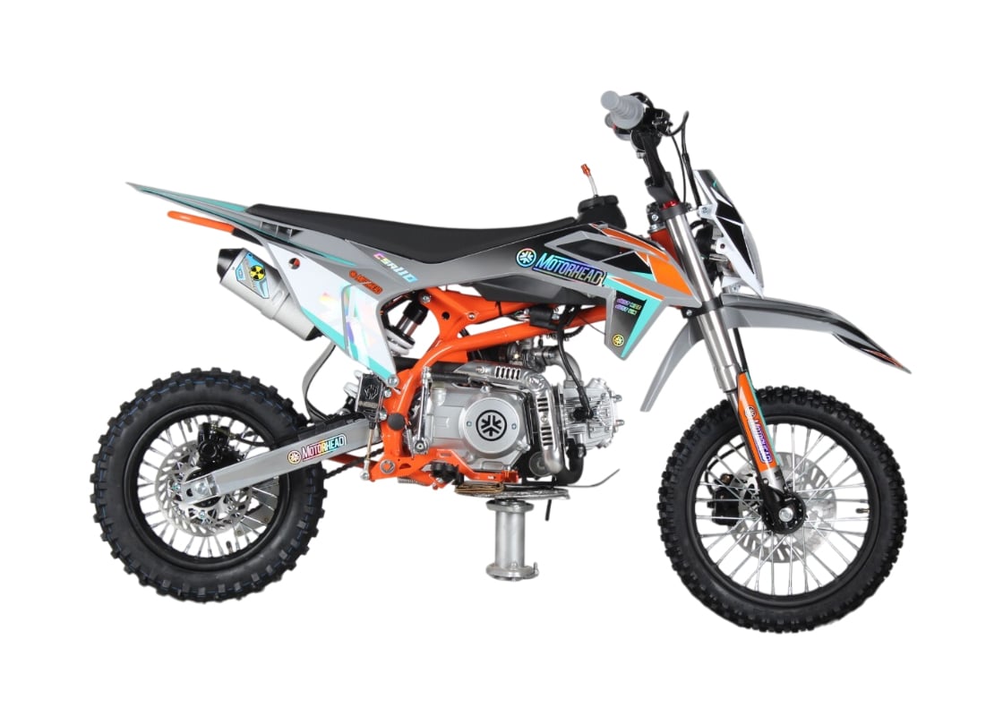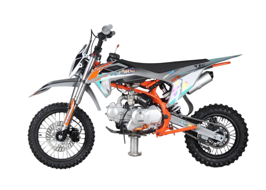 MOTORHEAD CSA110 14/12 - лёгкий детский питбайк с двигателем 110 см³. Оснащён полуавтоматической коробкой передач и воздушным охлаждением. Имеет прочную стальную раму и надёжные дисковые тормоза. Отличается удобной посадкой и мягкой подвеской. Подходит для детей и подростков до 14 лет.