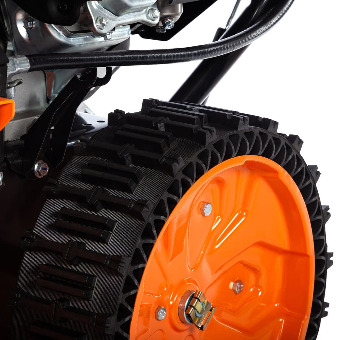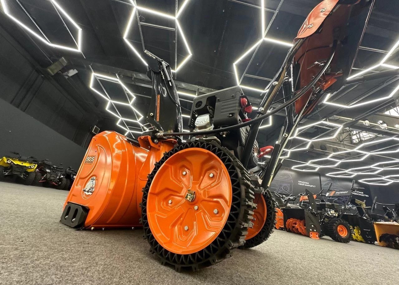 На Kettama 90S также установлены безвоздушные шины SnowLink с технологией Runflat. Шины Runflat с глубоким протектором исключают пробуксовку агрегата на обледенелом участке. Увеличенное сцепление даёт возможность достичь показателей производительности практически равных гусеничному шасси. При этом, более низкий общий вес снегоуборщика позволяет достигать на этой модели показателей производительности до 9 т/ч с влажным лежалым снегом плотностью до 400 кг/м3. На свежевыпавшем влажном снегу плотностью до 200-250 кг/м3 этот снегоуборщик имеет производительность до 18-20 т/ч. Шины позволяют достигать высокого сцепления и производительности даже во время поворотов.