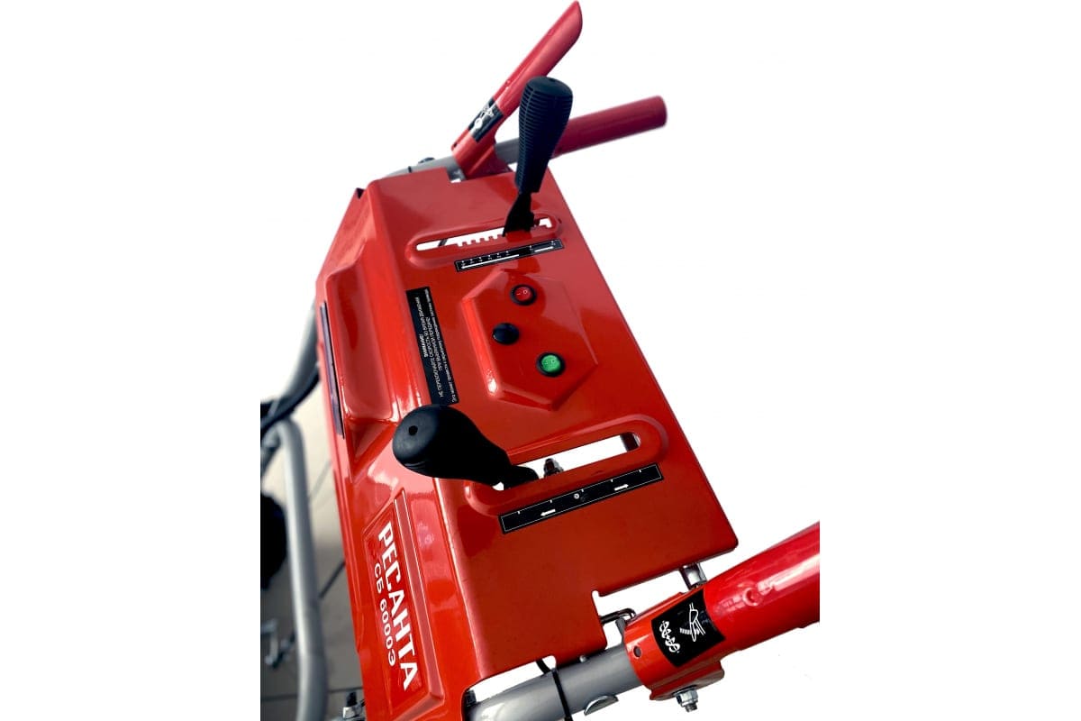 Самоходный снегоуборщик Ресанта СБ 6000Э предназначен для расчистки снега с небольших дорожек и территорий, например, возле загородного дома. Управление осуществляется с помощью рычага регулировки скорости и рычага для регулировки направления и дальности выброса, которые вынесены на панель оператора.